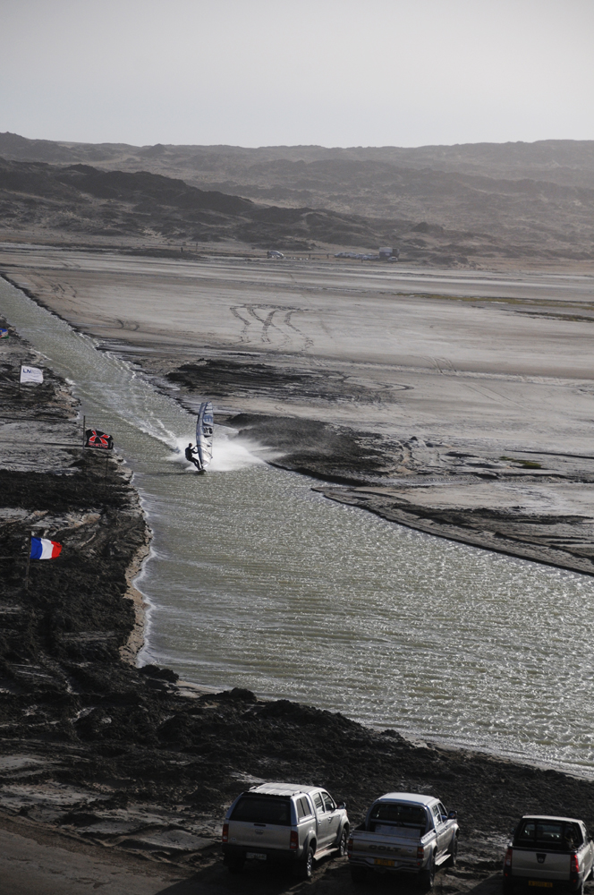 Les stats de vent dans cette partie du monde sont assez incroyables. Les périodes varient bien sur selon les années, mais Lüderitz reste un des endroits les plus sûr en ce qui concerne la fréquence et l’intensité du vent depuis des années. Là bas naviguer dans un vent extrême et dans un canal qui plus est, n’est plus un problème. Le désert qui se situe à quelques kilomètres et les collines « diamanteuses » qui entourent le spot permettent d’avoir un vent chaud qui s’accélère dans un effet venturi.