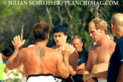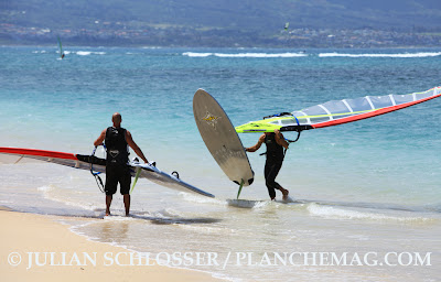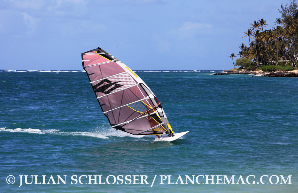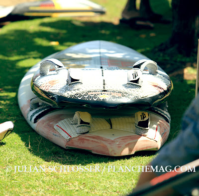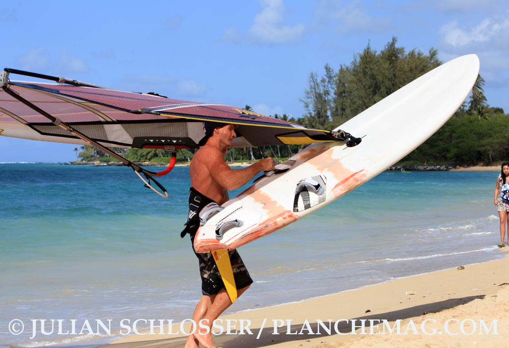 D’autres personnes qui bossent aussi beaucoup, c’est le couple Buzianis/McGain. Les 2 anciens du circuit testaient des prototypes de JP Australia Slalom. Ils étaient équipés tous les deux d’une Maui Sail TR8 9,3m. Le shaper Werner Gnigler restait au bord de l’eau pour récolter les informations.