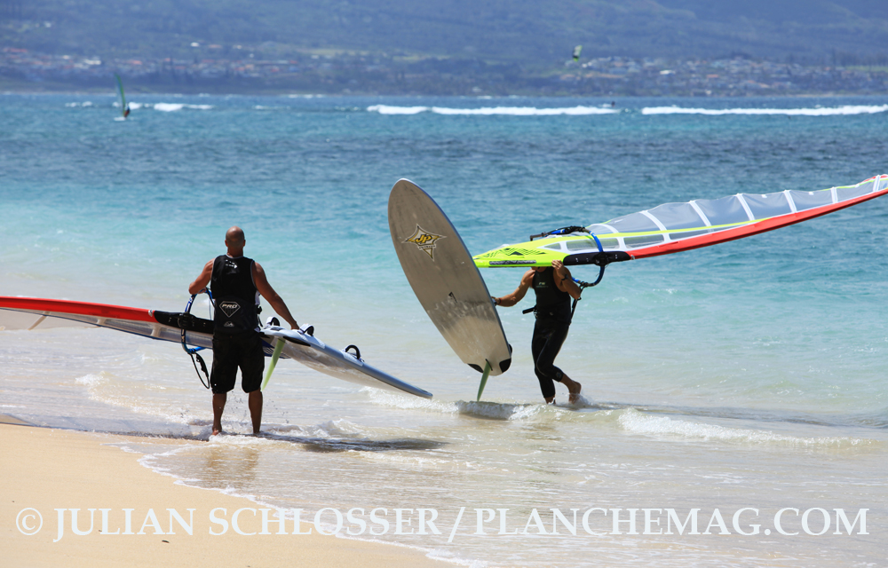 D’une façon plus décontractée, le team Naish fait son apparition pour tester une nouvelle planche de Slalom-Freerace shapée par Richard Green ainsi qu’un prototype d’une future voile de freerace ultra compacte. La 8,8m se grée sur un mât de 4,60m. Michi Schweiger, Kai Lenny et Robby Naish Himself sont de la partie. Etonnant. Ils enchaîneront les bords les uns après les autres.