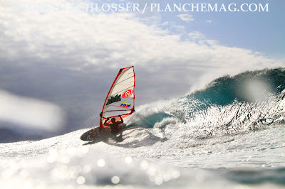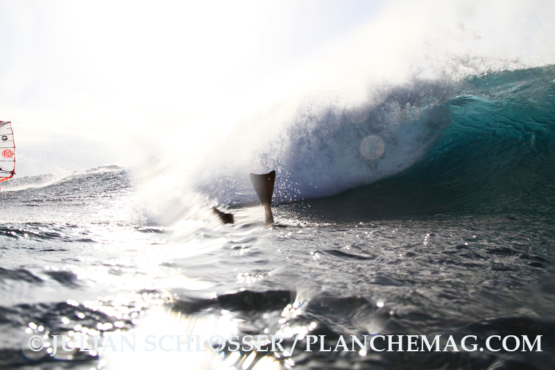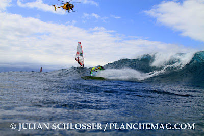 Malgré des conditions toujours pas au top, le team Neil Pryde se met à l’eau dès l’arrivée de l’hélicoptère transportant photographe et caméraman. Tous les waveriders sont là et essaient de faire de leur mieux sur l’eau malgré la difficulté de prendre des vagues.