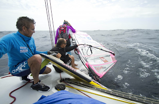 Après une courte conversation par VHF pour demander à son bateau de moins abattre, Sarah est simplement revenue vers ce dernier pour un arrêt et quelques réglages de routine sur sa planche, avant de repartir de plus belle.