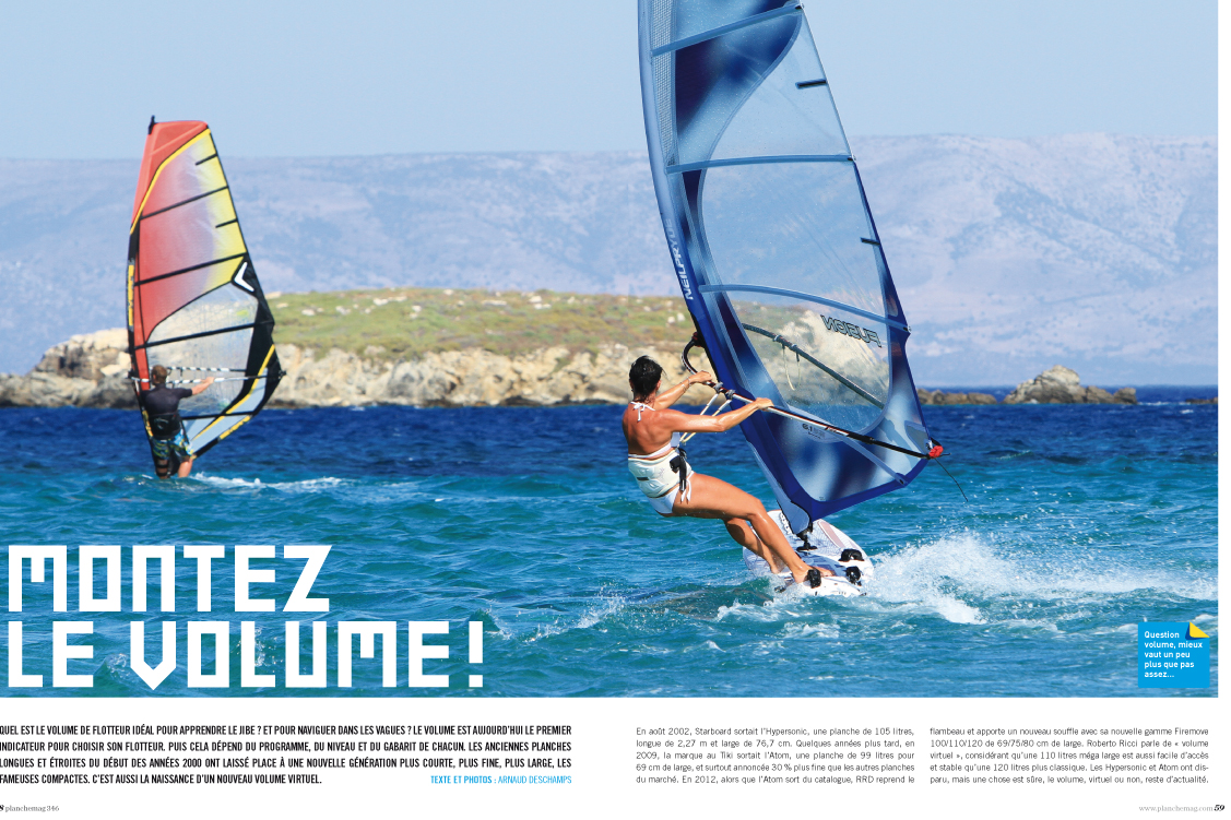 En août 2002, Starboard sortait l’Hypersonic, une planche de 105 litres, longue de 2,27 m et large de 76,7 cm. Quelques années plus tard, en 2009, la marque au Tiki sortait l’Atom, une planche de 99 litres pour 69 cm de large, et surtout annoncée 30 % plus fine que les autres planches du marché. En 2012, alors que l’Atom sort du catalogue, RRD reprend le flambeau et apporte un nouveau souffle avec sa nouvelle gamme Firemove 100/110/120 de 69/75/80 cm de large. Roberto Ricci parle de « volume virtuel », considérant qu’une 110 litres méga large est aussi facile d’accès et stable qu’une 120 litres plus classique. Les Hypersonic et Atom ont disparu, mais une chose est sûre, le volume, virtuel ou non, reste d’actualité…
