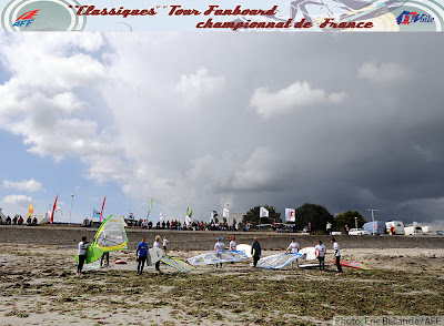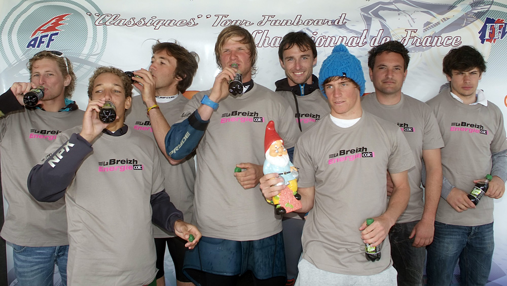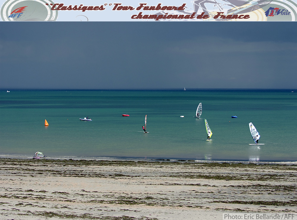 Et le public n’est pas le seul à être venu soutenir et observer les prouesses des jeunes loups du funboard. Patrice Belbeoc’h, figure du windsurf, et invétéré de La Torche -on se souvient de sa victoire en 86 face à Robby Naish- est venu avant hier faire un tour sur le spot de Loctudy. Hier c’est Bruno André qui s’est joint à la meute en faisant une démonstration de foil windsurfing à côté des coureurs.