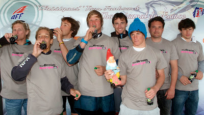 A quelques mètres de la plage les riders ont joué entre deux bouées : répartis en 8 équipes de 3 pour une course de relai, ils devaient prendre le départ à 4 équipes et virer deux bouées avant de refranchir la ligne de départ qui faisait également office de ligne d’arrivée. Après plus d’1h de course c’est le Team NP/JP composé d’Alexandre Cousin, Alexandre Navarro et Thibaut Bernard qui sort vainqueur.