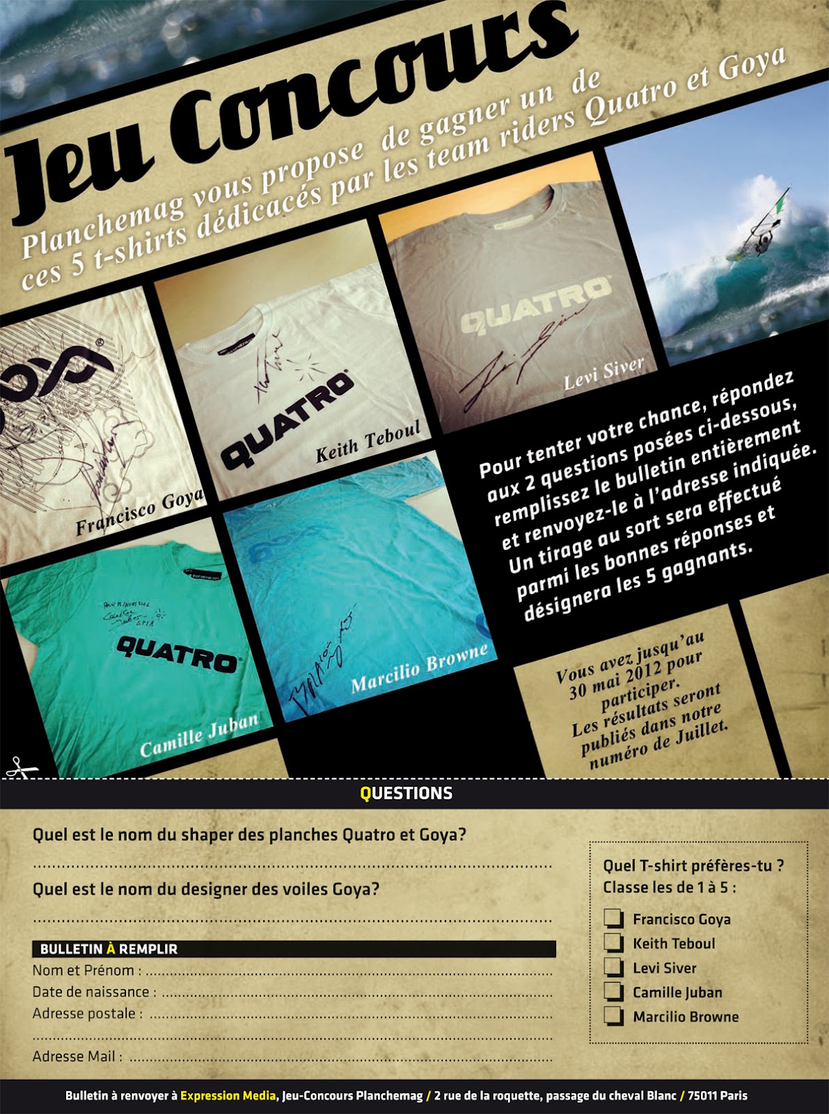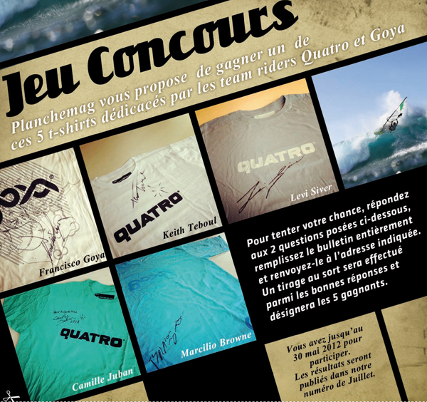 Au mois de Mai, Planchemag vous propose de gagner un T-shirts dédicacé par les teams riders des marques Quatro et Goya.
