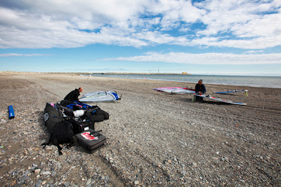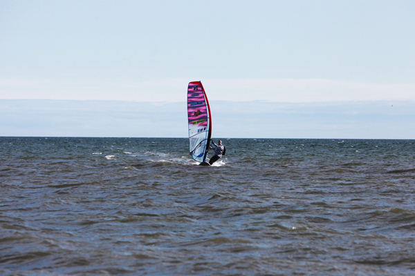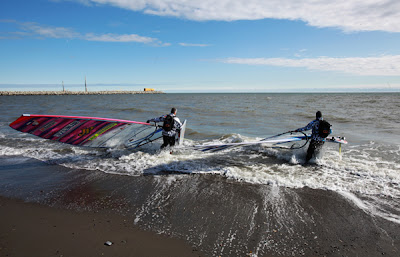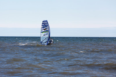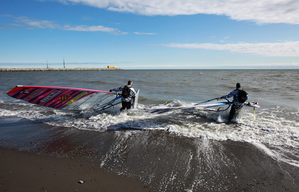 Aujourd’hui, alors qu’aucun vent n’était prévu, une petite brise s’est levée tout au long de l’après midi permettant à Alain et Michel de s’offrir leur première session de windsurf sur le mer de Bering.