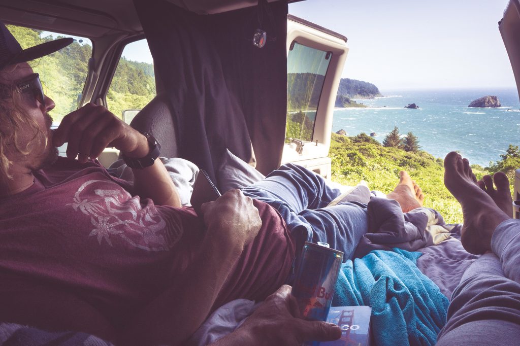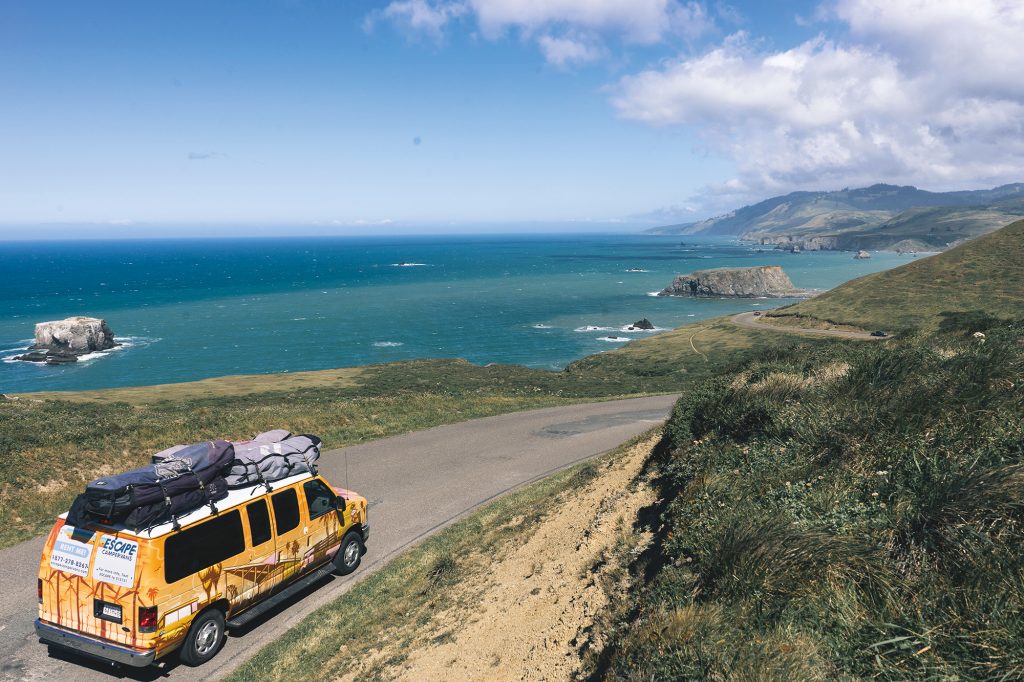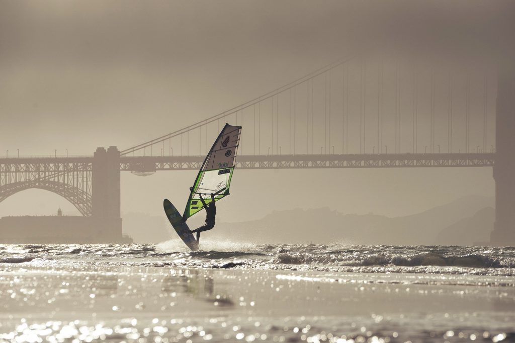 Une fois ce chargement fini, Graham nous lâche devant Escape Campervan, où nous avons loué notre van. Il sera notre habitacle pour les 2 semaines à venir : couchages, frigo, kitchenette et, plus important, 4 barres de toit, c’est parfait. Après un nouvel exploit de chargement et de rangement (nous avons fait rentrer 100 kg de matos dans le véhicule), il nous reste juste assez d’espace pour dormir. Nous démarrons la Ford, avalons notre premier burrito du trip et roulons tranquillement vers le Golden Gate. Le vent hurle. Beaucoup de windsurfers et de kitsurfers ont pensé à venir sur ce pont de 2,7 km de long, et 227 m de haut. Nous nous garons à Crissy Fields, au sud du pont et décidons de nous mettre à l’eau avant de poursuivre notre route vers les terres sauvages.
