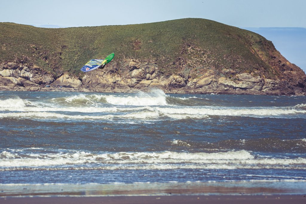 Ici, le temps suit un schéma assez simple. Le vent du sud amène des nuages et de la pluie avec, de temps en temps, assez de vent pour windsurfer, alors que le vent du nord amène du soleil et de forts vents d’après-midi. Pourtant, quand nous atteignons Pistol River, la situation n’est pas du tout meilleure, jusqu’à ce qu’enfin le soleil perce les nuages et que le vent monte… Il est temps de se payer une bonne nav’ ! C’est dément. Armés de notre plus petite voile, nous volons littéralement sur Pistol River, également connue sous le nom « The Rock ». Le vent est side onshore et le shore break devient rapidement difficile.