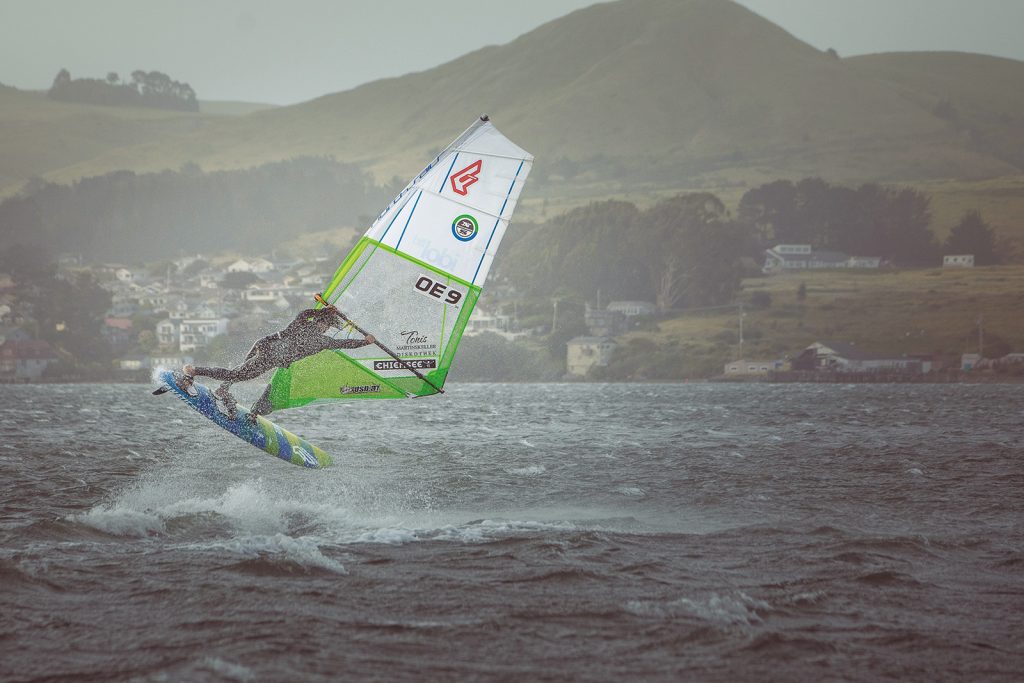 Nous gréons la plus petite voile que nous avons, et frissonnons aux premiers pas dans l’eau glaciale. Sans prise, nous nous battons pour rester au vent face aux 40 nœuds. Dix pas sont épuisants, cent nous donnent l’impression de faire un marathon. Et l’eau n’est pas plus profonde en avançant. Après plus de trente minutes d’une marche exténuante, nous montons enfin sur nos planches et arrivons à partir au large sans trop bloquer nos ailerons… Il y a tellement de vent qu’il nous est impossible de tenter des moves et bientôt, nous ne sentons même plus ni mains ni nos pieds.