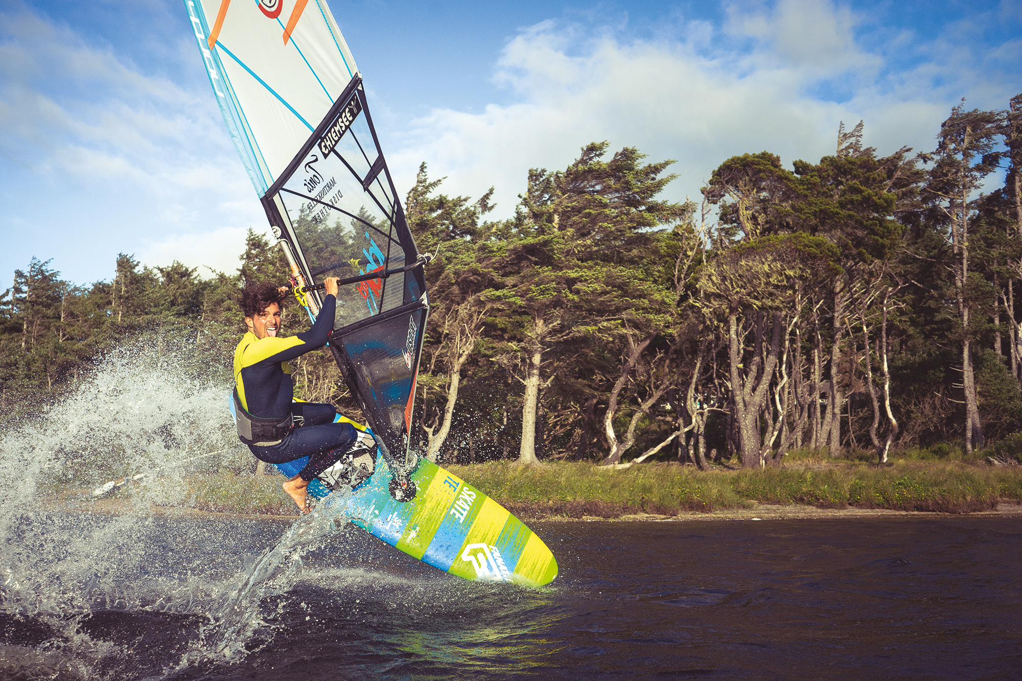 Ici, le temps suit un schéma assez simple. Le vent du sud amène des nuages et de la pluie avec, de temps en temps, assez de vent pour windsurfer, alors que le vent du nord amène du soleil et de forts vents d’après-midi. Pourtant, quand nous atteignons Pistol River, la situation n’est pas du tout meilleure, jusqu’à ce qu’enfin le soleil perce les nuages et que le vent monte… Il est temps de se payer une bonne nav’ ! C’est dément. Armés de notre plus petite voile, nous volons littéralement sur Pistol River, également connue sous le nom « The Rock ». Le vent est side onshore et le shore break devient rapidement difficile.