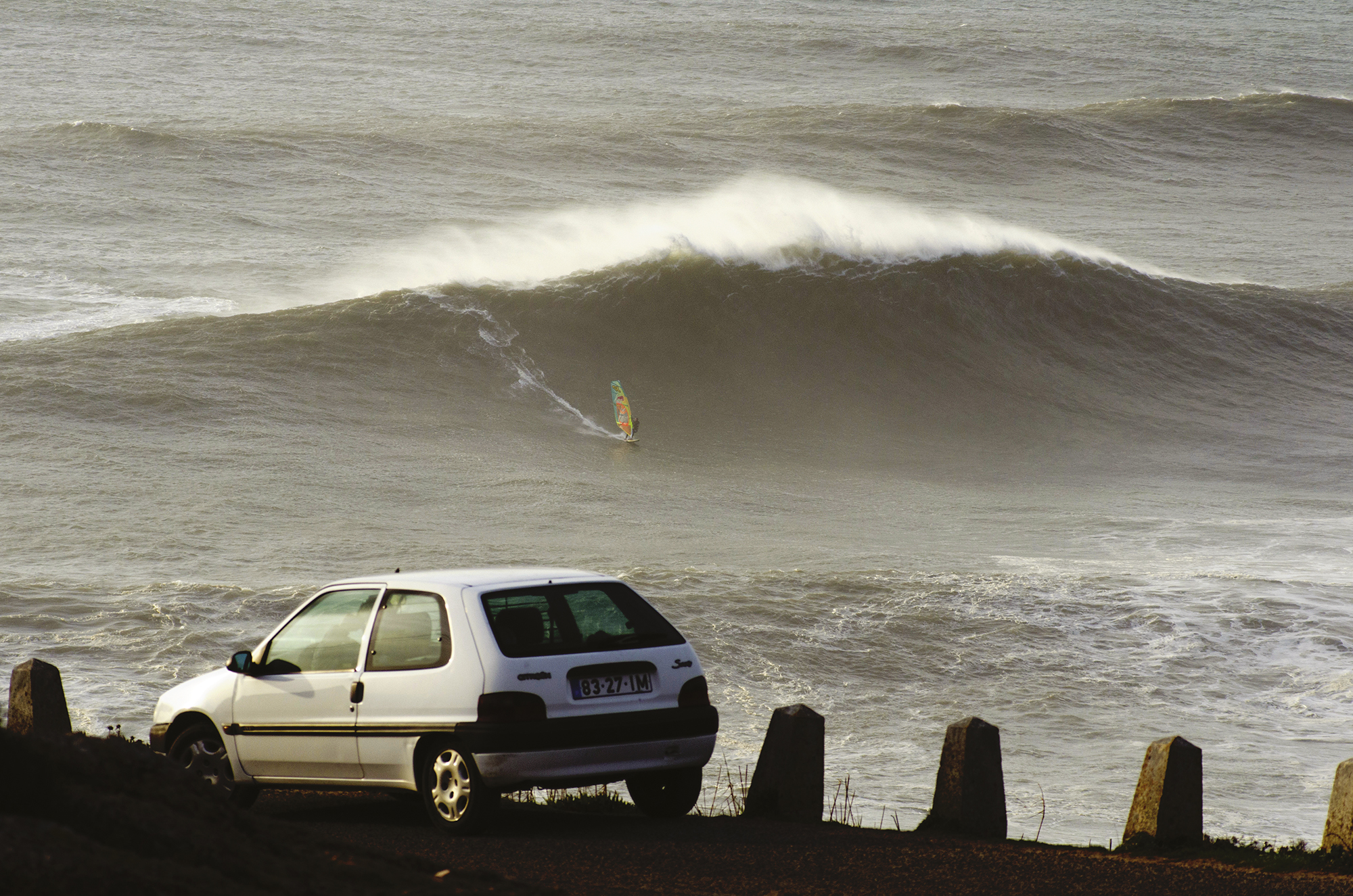 À 11 heures, une légère brise anime les drapeaux. C’est maintenant ou jamais. J’espère juste que le vent me donnera assez de puissance quand je serai au line up. J’ai été dans d’autre endroits par le passé où j’ai attendu trop longtemps et raté le seul couloir de vent de la journée. Donc, pas d’hésitation aujourd’hui. J’attrape un bateau pour partir au large avec deux pêcheurs portugais qui ne parlent pas un mot d’anglais et dont le regard étrange m’accompagne durant notre lente course vers le large. Nous avançons doucement et, même si j’ai le temps de me concentrer, rien ne me prépare à la vue du point break à fleur d’eau. Les vagues sont monstrueuses et plus j’approche, plus je me rends compte du côté dément de la situation. La chose la plus inquiétante à ce moment-là est l’absence de vent et le fait que je vais dériver vers la zone d’impact sans puissance pour me retrouver dans de sales draps.
