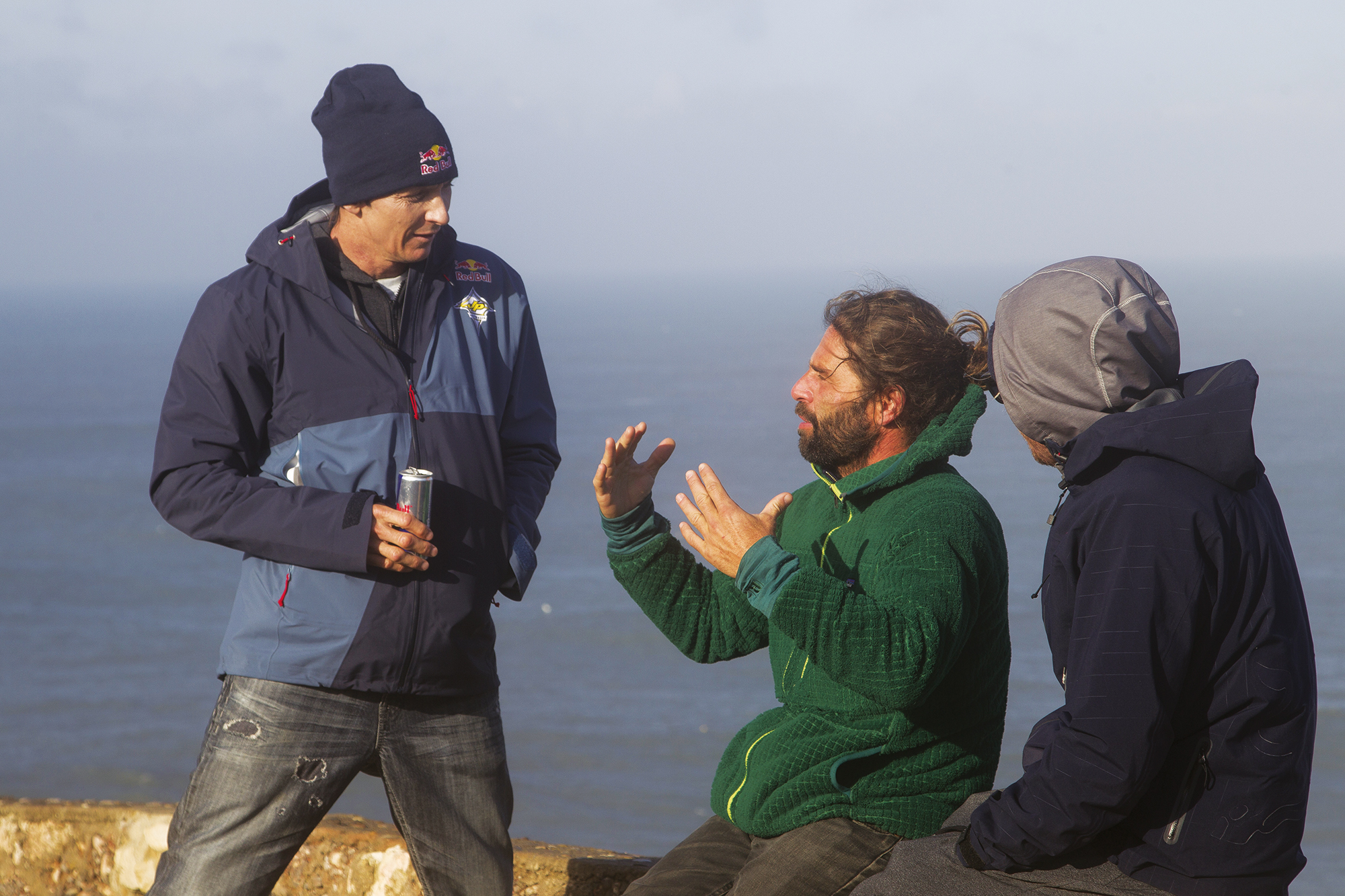 Je sais qu’un swell régulier existe tout au long des mois d’hiver, mais que la direction et la puissance du vent faiblissent le long du corridor. Après trois mois d’attente, on annonce enfin de bonnes prévisions et, bien que le vent soit très faible, je décide de me lancer. Au total, le projet rassemble 20 personnes (dont l’équipe de production). Andrew Cotton, mon pote du team Red Bull, le rider portugais de grosses vagues Hugo Vau et le photographe local Jorge Leal sont là : leur présence est indispensable, notamment pour observer les règles de sécurité qui me permettront de rester tout simplement en vie. Andrew et Hugo font partie du meilleur team de sauvetage de Nazaré – les avoir auprès de moi pour assurer ma sécurité en mer est juste incroyable. Et sans Jorge Leal, ce projet n’aurait jamais pu aboutir (merci Jorge !).