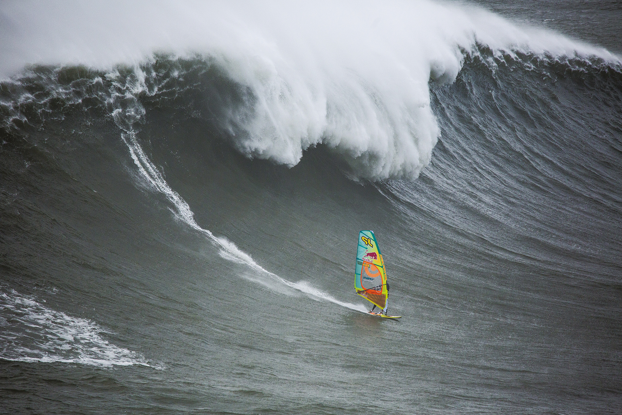 Vous n’êtes jamais en sécurité à Nazaré. Des gros sets de vagues déboulent dans des angles si extrêmes que cela impacte même la direction du vent. Les unes sont trop onshore, les autres trop offshore. Certaines arrivent même en deux angles différents et fusionnent quelque part, laissant à la chance plus qu’à l’habileté la possibilité de rider. Les deux jet-skis peuvent chasser ses vagues à environ 40 km/h pour trouver le point de départ parfait. Mais pour un windsurfeur avec 12 nœuds de vent, c’est juste impossible. J’ai attendu six heures à l’eau et attrapé seulement deux bonnes vagues !