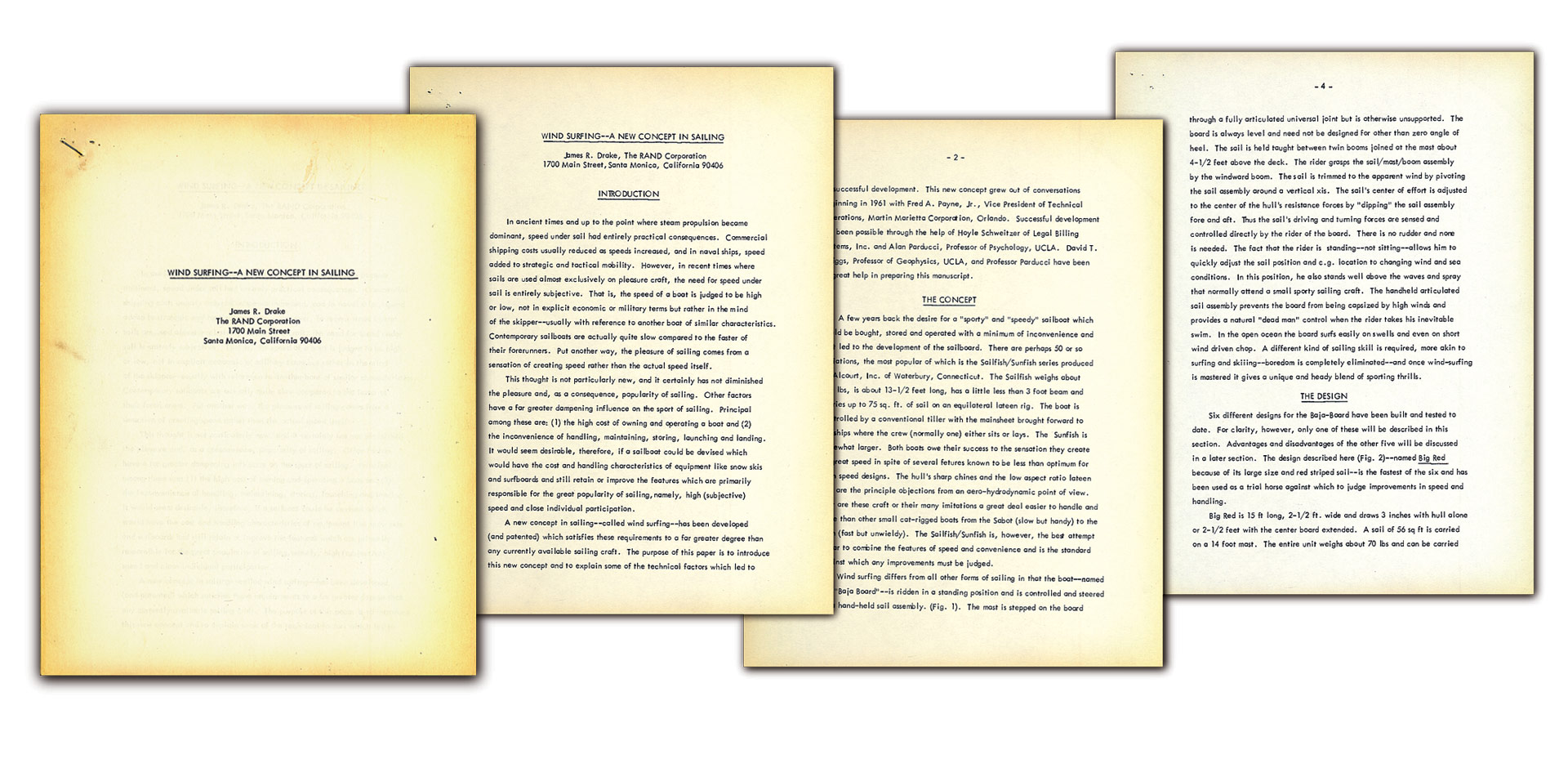 Le manuscrit original de Jim Drake, A New Concept in Sailing, est consultable dans son intégralité sur Internet. Ce document d’une dizaine de pages, présenté par Jim Drake le 26 avril 1969 lors d’une conférence à l’Institut américain d’aéronautique, détaille par le menu les données techniques de son invention et jette les bases de la pratique. À partir de 1998, alors à la retraite et suite à une rencontre fortuite avec Svein Rasmussen, qui venait de créer la marque Starboard, Jim Drake s’offre une seconde jeunesse, avec le bonheur que l’on sait, collaborant activement au développement de la marque jusqu’à sa mort le 20 juin 2012, date à laquelle nous sommes tous devenus un peu orphelins…