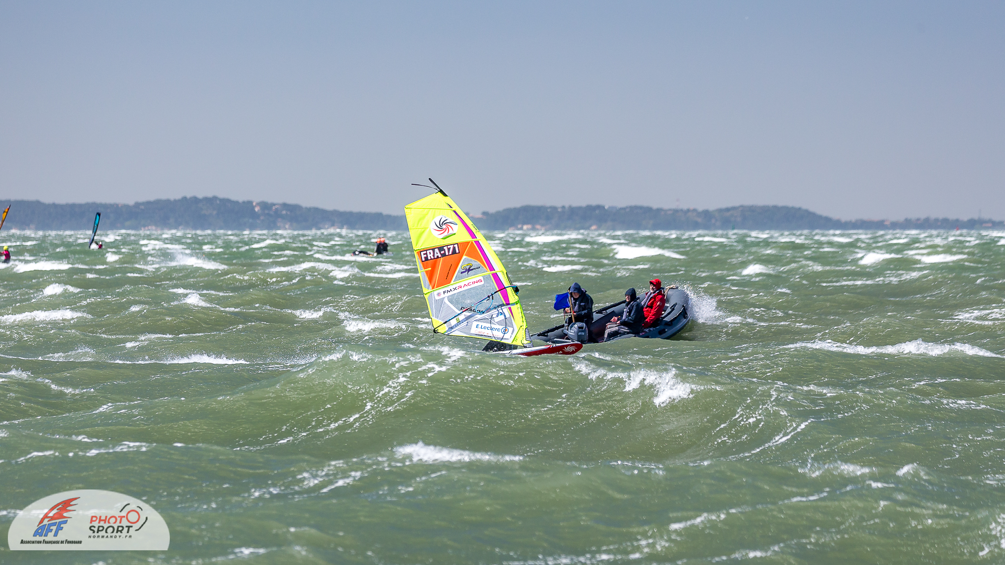 Ajoutons les malchanceux, comme Benoit Merceur qui casse son mât et Pierre Mortefon sa têtière en demi-finale. Le hollandais Jordy Vonk en 5,0 m² et Cédric Bordes en 5,5 m² saisissent l’occasion pour se livrer bataille dans la première finale de l’année. Sur un plan d’eau qui fume, Jordy serein en 5,0 m² s’impose logiquement devant Cédric et Pierre Macquaert. Chapeau au poids plume de la bande, Brendan Lorho qui termine 5ème.