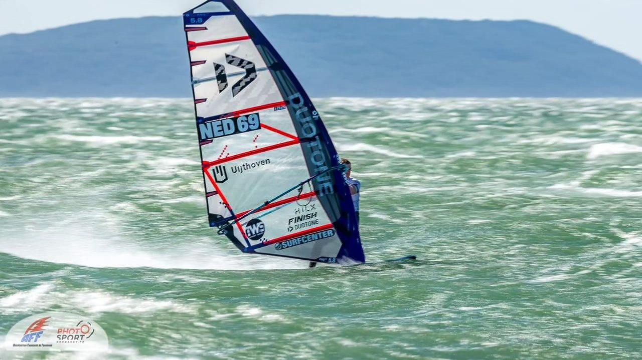 En finale, comme sur les tours précédents, Pierre Mortefon, est le plus rapide et le plus à l’aise sur ce plan d’eau défoncé avec sa 6,0 m². Alors qu’il mène la course, il chute sur l’entrée du deuxième jibe et rétrograde à la 7ème place. Jordy Vonk en profite et assure une nouvelle victoire devant Jimmy Thiémé équipé de ses nouvelles Patrik. Alors que Pierre Macquaert est 3ème à cent mètres de l’arrivée, il se fait coiffer par un Pierre Mortefon revenu de Vauvert à Mach2.
