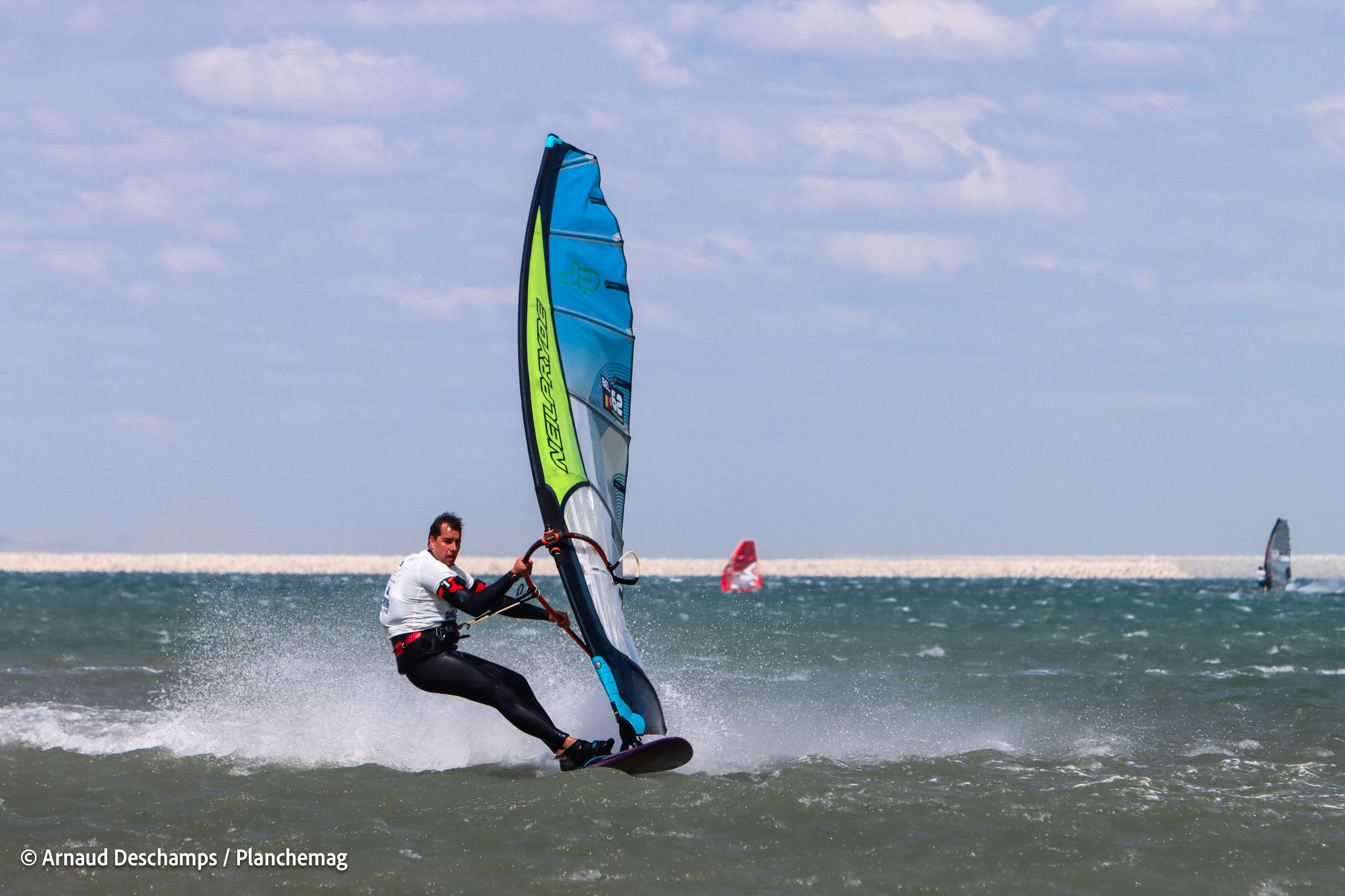 Pierre réalise trois belles manches de cinq en jonglant entre sa voile de 6 m² et une 5 m² d’emprunt lorsque les autres sont calés en 5,3 m² sur du matos qu’ils connaissent sur le bout des doigts. Il bataille avec trois autres glisseurs plus réguliers, l’anglais Scotty Stallman, l’inoxydable Ben Van Der Steen passé chez Gun Sails et l’infatigable Cédric Bordes, le chaperon rouge du run en Severne.