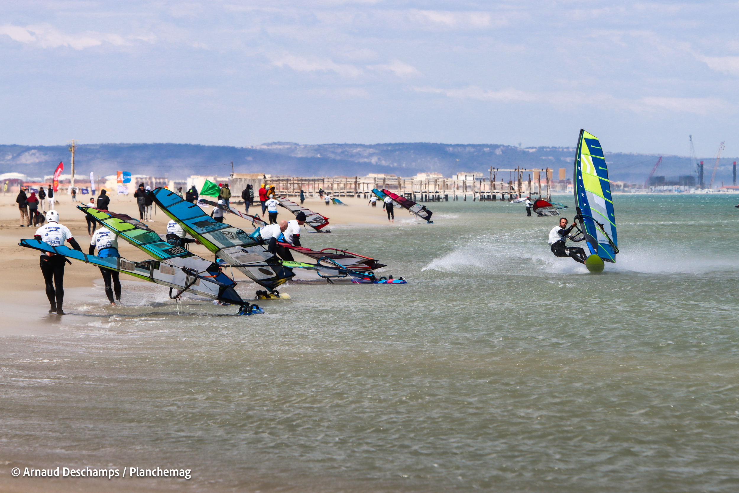Du 21 au 30 avril, 43 hommes et quatre femmes parmi les windsurfers les plus rapides de la planète sont réunis dans l’Aude près de Leucate pour le championnat du monde de vitesse. Le principe est simple sur le papier, aller le plus vite possible entre deux bouées distantes de 500 mètres durant quarante-cinq à soixante minutes, voire plus si le directeur de course Principe Baldini décide d’une extension.