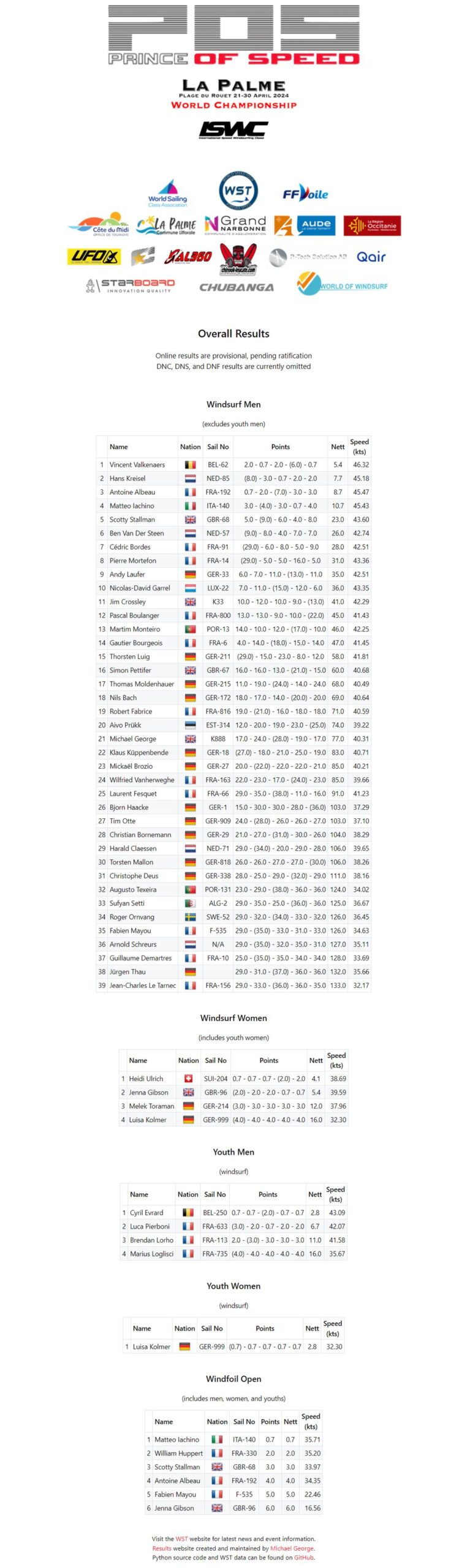 Après trois jours de course, les 22, 23 et 24 avril dans une Tramontane forte et à l’issue de cinq manches, Vincent Valkenaers chez les hommes, Heidi Ulrich chez les femmes et Cyril Evrard chez les jeunes ont été les plus réguliers. Le retour de la Tramontane n’étant pas prévu avant la fin de la course, on peut les sacrer avant l’heure champions du monde 2024. En parallèle, la course en foil n’est pas terminée.