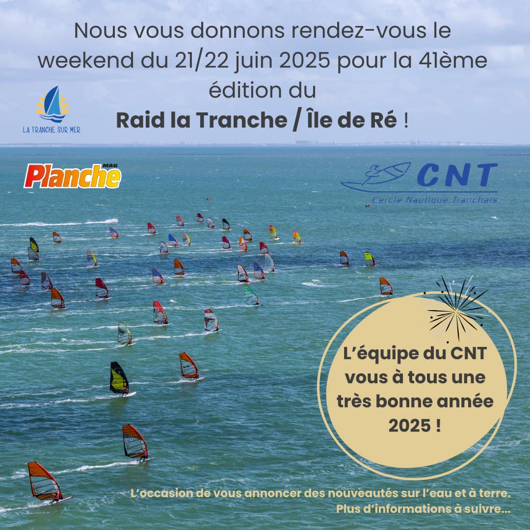 Catégories Compétitions 13 janvier 2025 Raid La Tranche / île de Ré 2025 Le RDV est donné les 21 et 22 juin par le Cercle Nautique Tranchais pour la 41ème édition du Raid La Tranche / île de Ré. Plus d’informations très vite sur les inscriptions et le planning de ce nouveau Week-end de fête du côté de La Tranche sur mer.