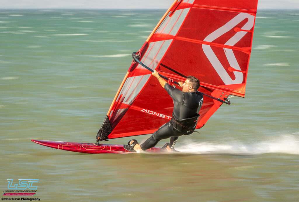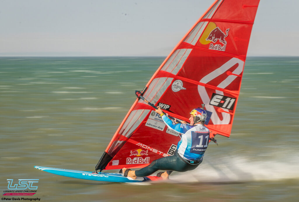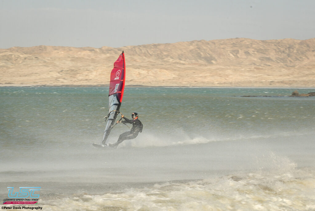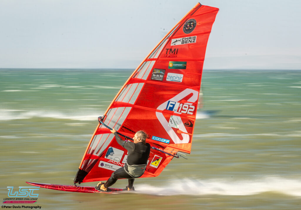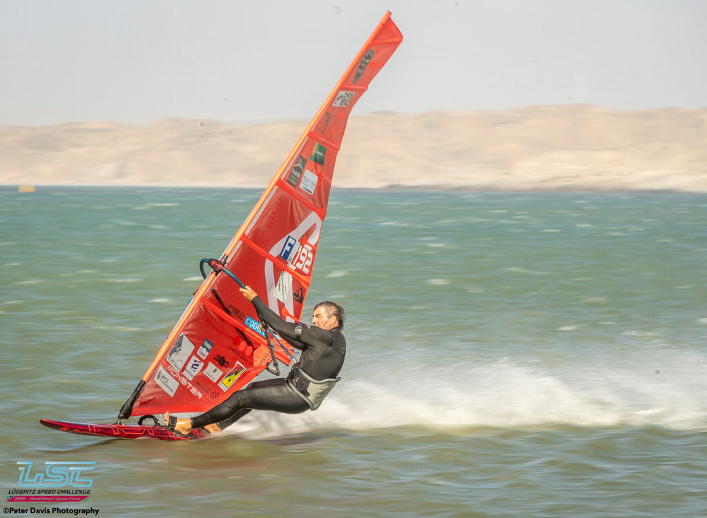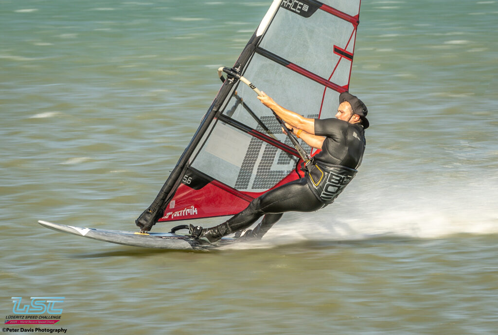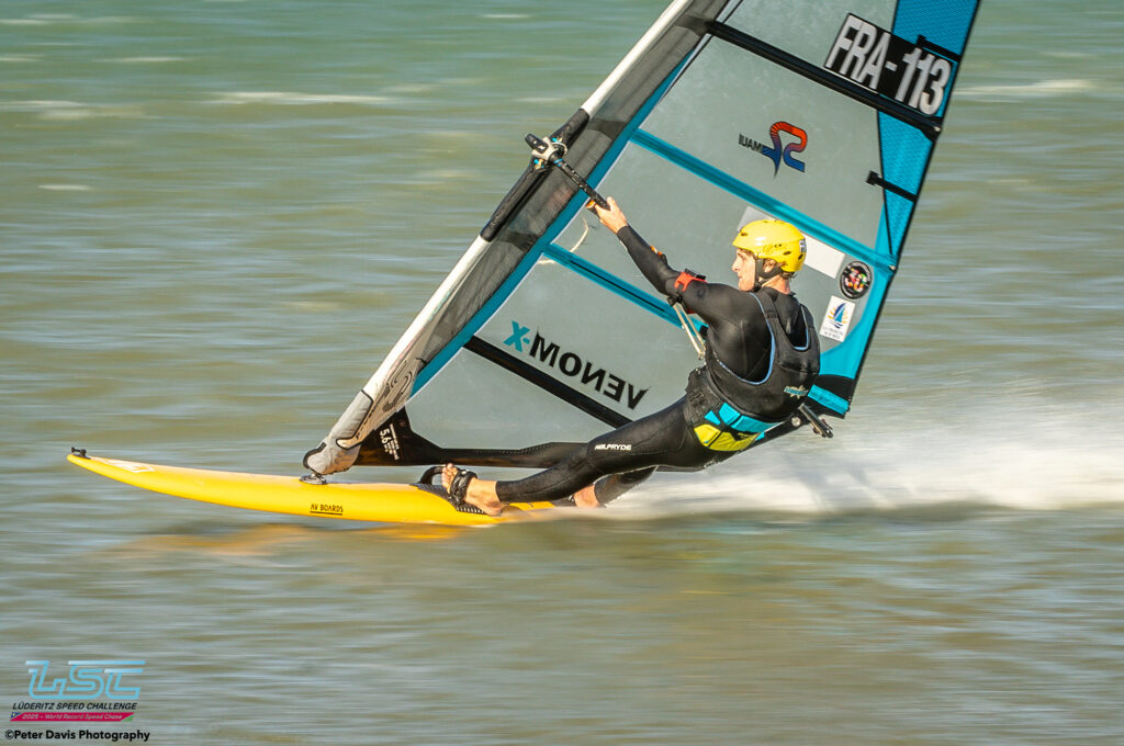Hier (Lundi 17/11/2025), petite journée à Diaz qui avait commencé très lentement avec très peu de vent. Sur le coup de 17h le vent est monté jusqu’à 40 nœuds pendant à peu près une petite heure. Ça soufflait aussi pas mal sur le canal, mais Raffaello (l’organisateur) avait décidé d’arrêter la waiting Period à 16h. Donc, ça a été une journée d’entraînement à Diaz. Ça tournait assez fort. Il y a eu des bons runs avec des chronos de 45, 48, 49 nœuds pour les meilleurs.