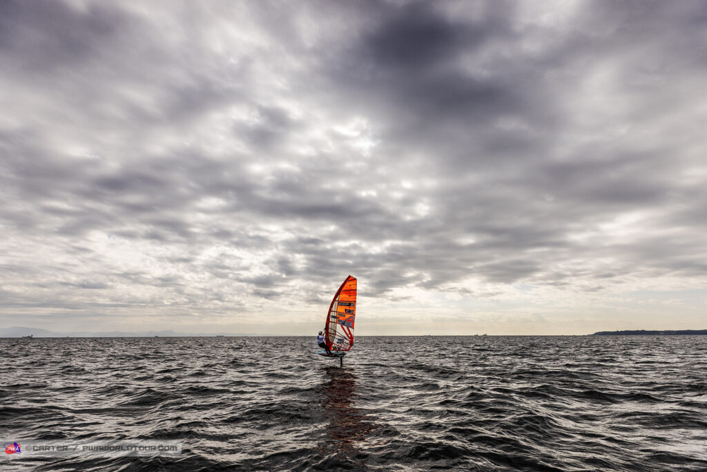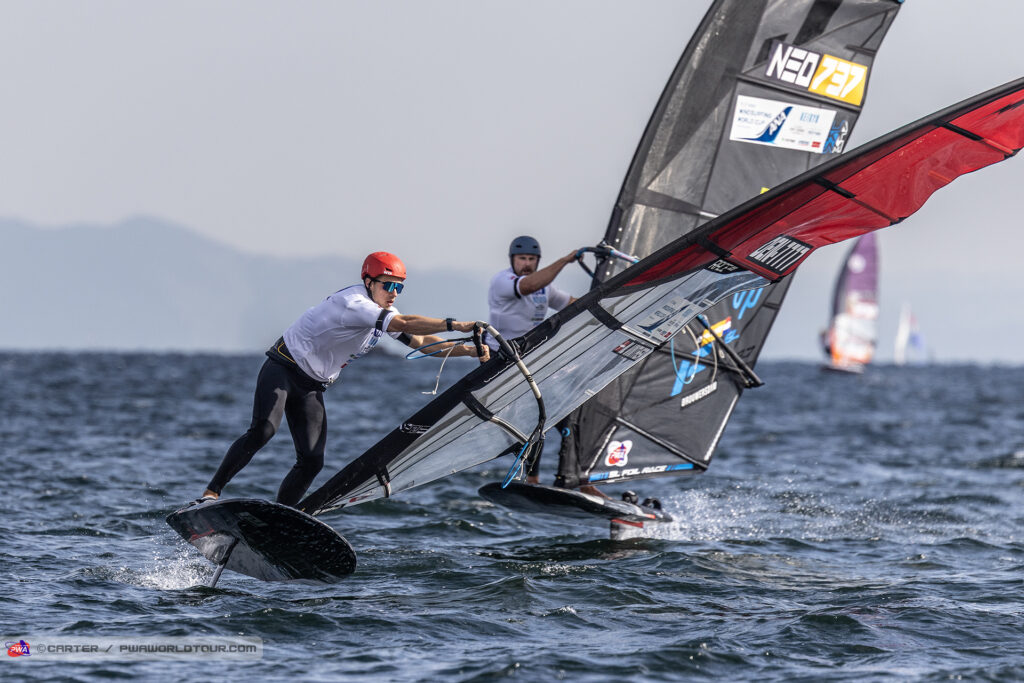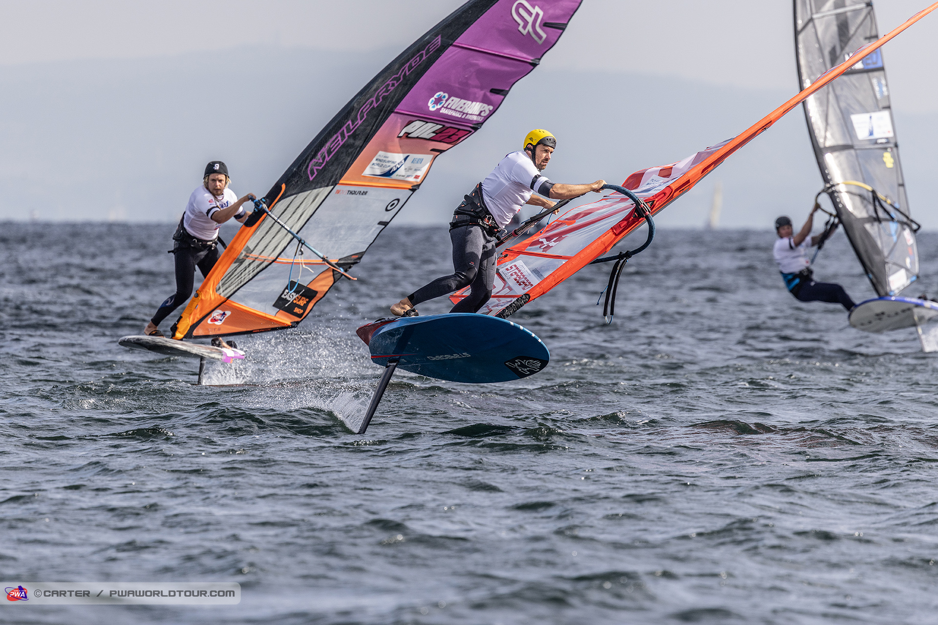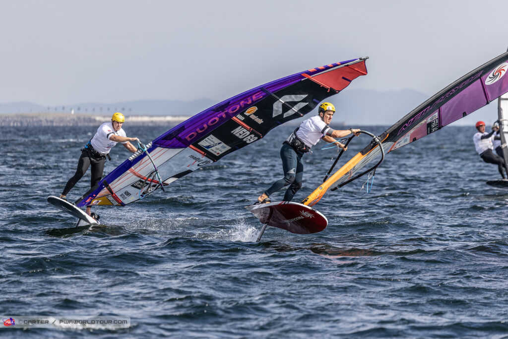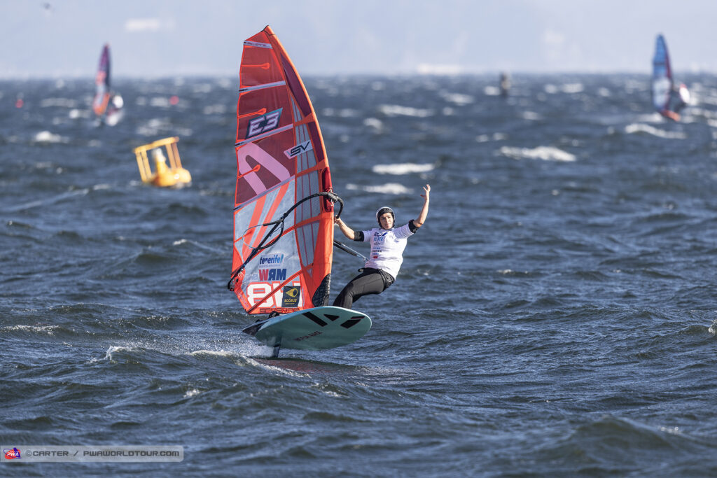 Honneur aux femmes, qui ont offert l’une des journées les plus folles de l’histoire de la PWA. Alors que Justine semblait voler vers un nouveau titre mondial en foil, après une domination toute l’année (6 victoires et 2 deuxièmes place), la machine s’est déréglée : Elle enchaîne les petites erreurs aux lourdes conséquences. Première finale : elle tombe, repart dernière et remonte 3ème, ça va encore. Deuxième finale : rappel général au départ, Justine pense être disqualifiée et repart à la plage, sans comprendre que la finale allait simplement être recourue avec toutes les filles. Grosse erreur, qui laisse Lina Eržen en position de lui ravir le titre.