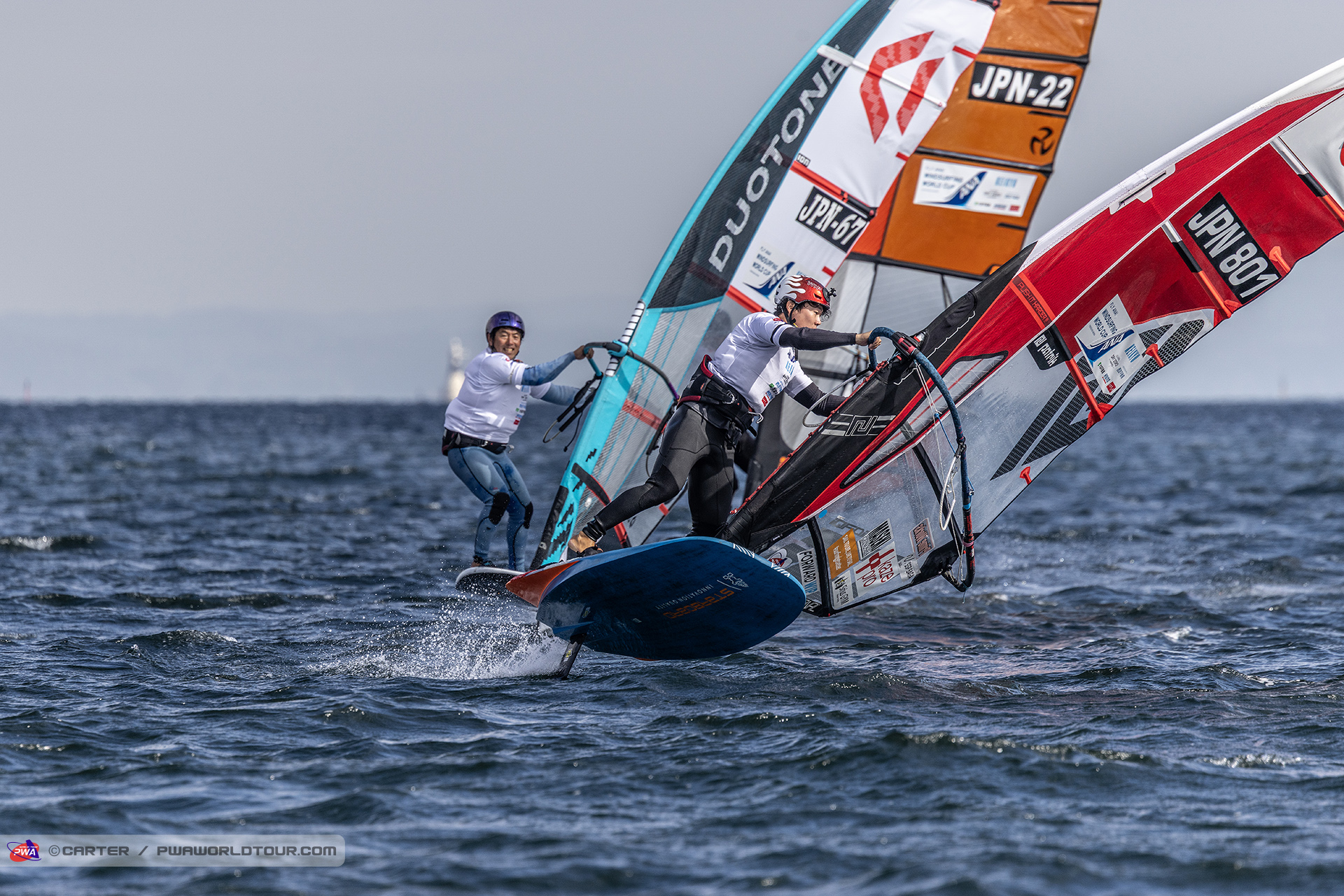 Pendant ce temps, la finale voit un superbe duel Lina Eržen / Blanca Alabau. Lina en tête, à un jibe seulement du titre mondial, chute en 4,9 m² et laisse Blanca décrocher non seulement sa seule victoire en finale cette année mais surtout la victoire au Japon, à égalité de points. Quel come-back de l’espagnole qui coiffe Lina sur le fil.