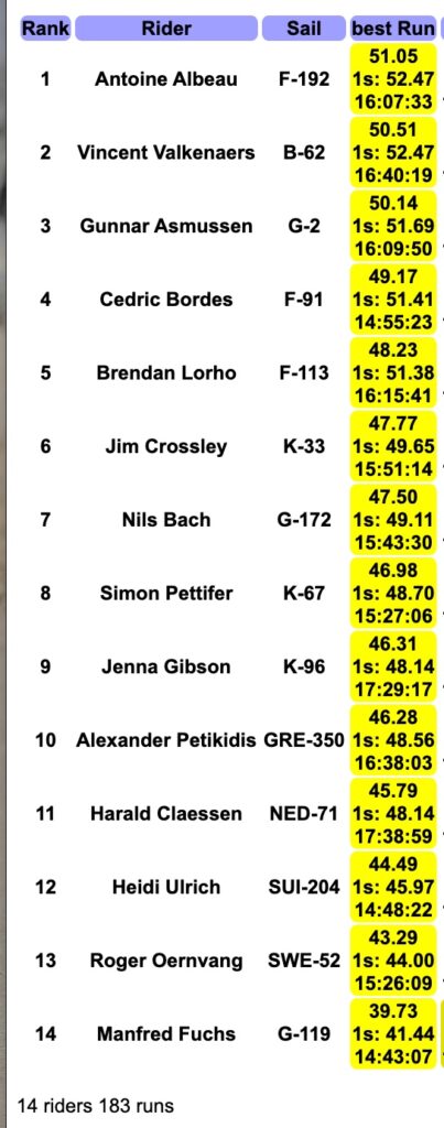 Quelques minutes plus tard, vers 16h Antoine Albeau sort un run a 51.05 nœuds [Vmax 52.47] qui sera la meilleure perf du jour. Grâce à ce run au-dessus de 51 nœuds, il passe prioritaire sur les départs et pourra, tout comme Jenna, faire plus de runs en faisant moins la file d’attente avec au maximum 2 rideurs devant lui.