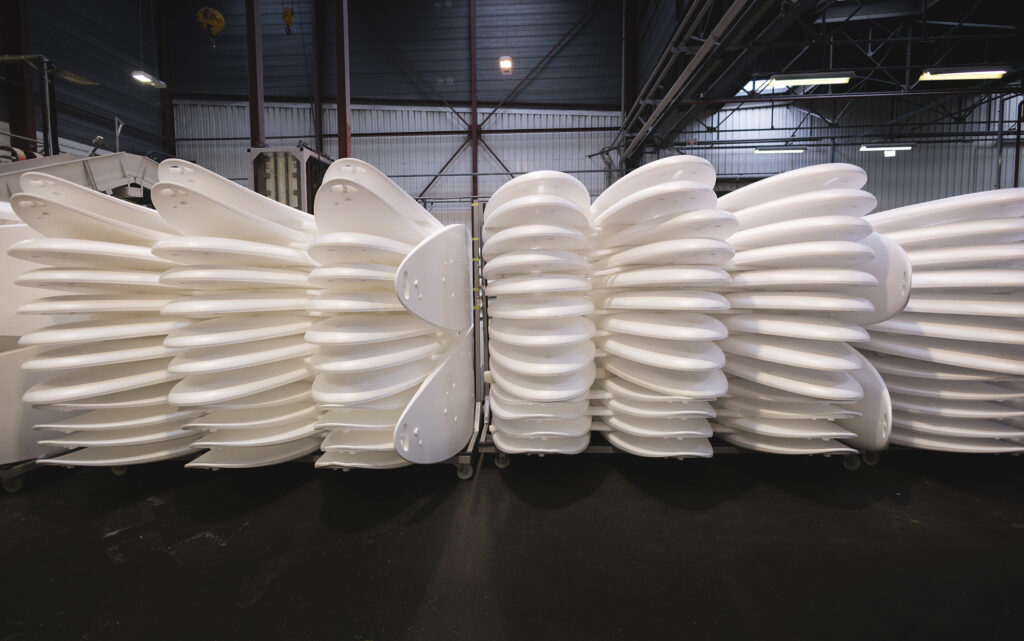 Aujourd’hui, on travaille sur deux technologies sur les planches à voile. Il y a la technologie Tough-Tech où le produit est constitué à 90% de polyéthylène et polystyrène expansé pour le corps de la planche (le pain de la planche) et de polyéthylène pour la peau, l’extérieur de la planche pour la durabilité. Nous avons aussi la technologie Ace-Tech où nous sommes sur une peau en ABS pour la résistance au choc et à la mécanique, de fibre de verre avec de résine polyuréthane avec, encore une fois, un corps en polystyrène expansé et moulé.